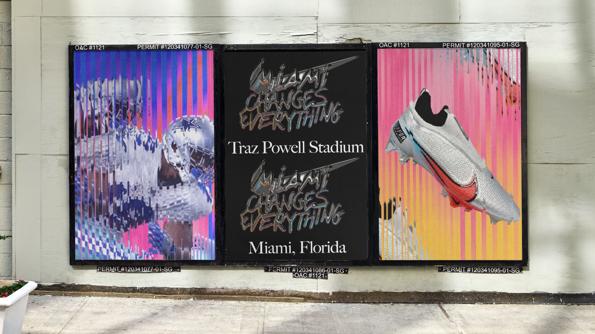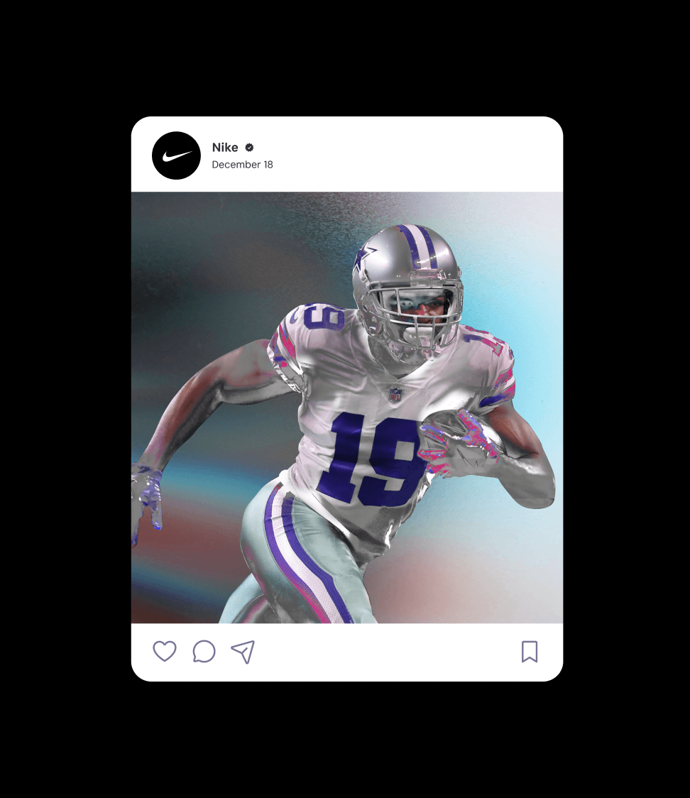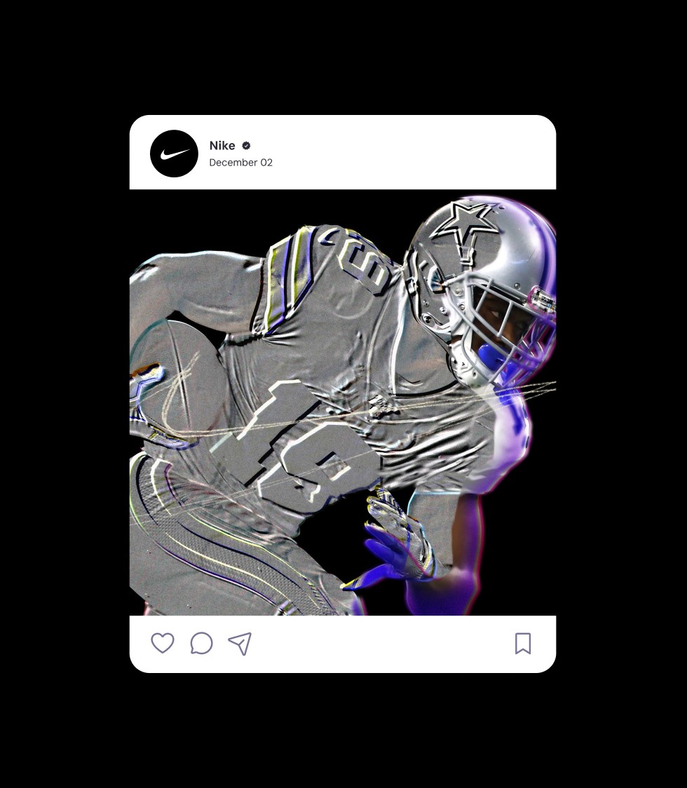 We pushed the world further by pulling from ’90s-era football aesthetics—when Miami stamped itself onto the map—and reframing that era with modern finish. Metallic textures inspired by South Florida’s turnover chain and the Heisman trophy introduced a chromed-out layer to the language, including solarized athlete treatments and iconography built from hyperlocal storytelling details.