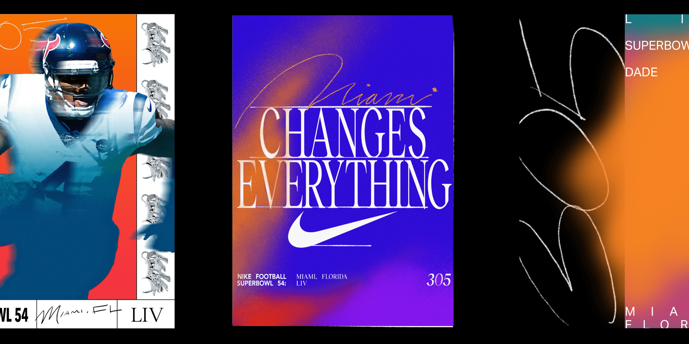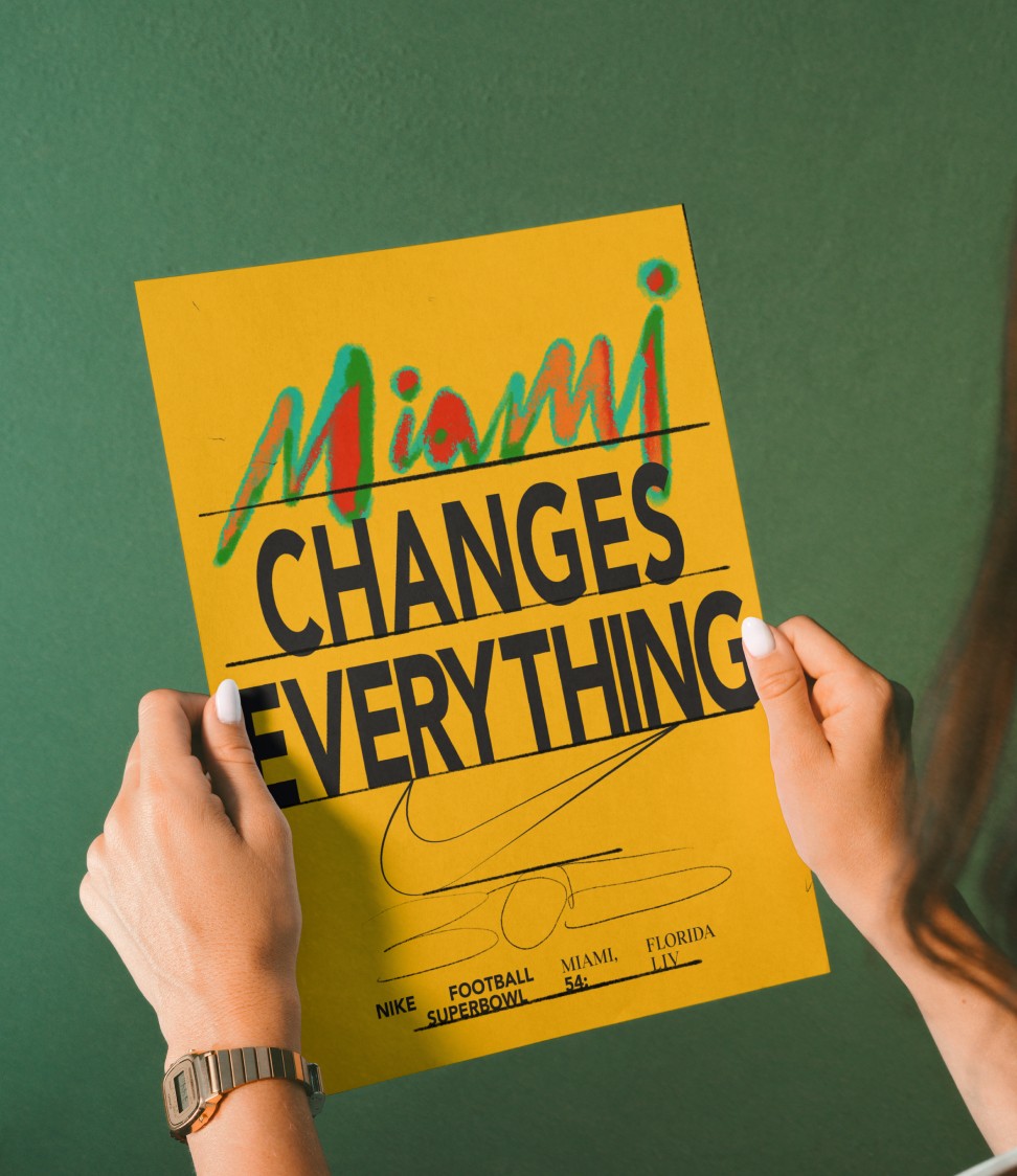 For Super Bowl LIV, we developed an early visual direction for Nike releases that leaned hard into Miami’s unique football culture—electric, sun-soaked, and unapologetically loud. The system evolved a retro spirit through gestural, hand-driven typography and the bold gradient heat of the Miami sunset, creating something that felt both familiar and freshly local.